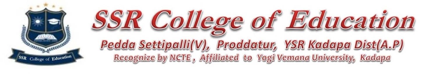Education is not a personal possession it is given to the one for the sake of many. SSR College of Education for Women has been founded by SSR Educational Soceity, Proddatur , YSR Kadapa Dist (AP) The College is a private no-grant organization and is working on the principle of self financing.SSR College of Education for Women is set in a well–planned campus, aesthetic building with well furnished Class-rooms, Library, Lecture Halls, Outdoor - Indoor Games & sports facilities, offer an ideal environment for Pursuit of professional career! We have launched in fulfillment of the solemn desire of the Society to provide excellent education in the area of teacher training in the year. Education in its true form means we break away the shekels of ignorance and accumulate the knowledge of the universe.